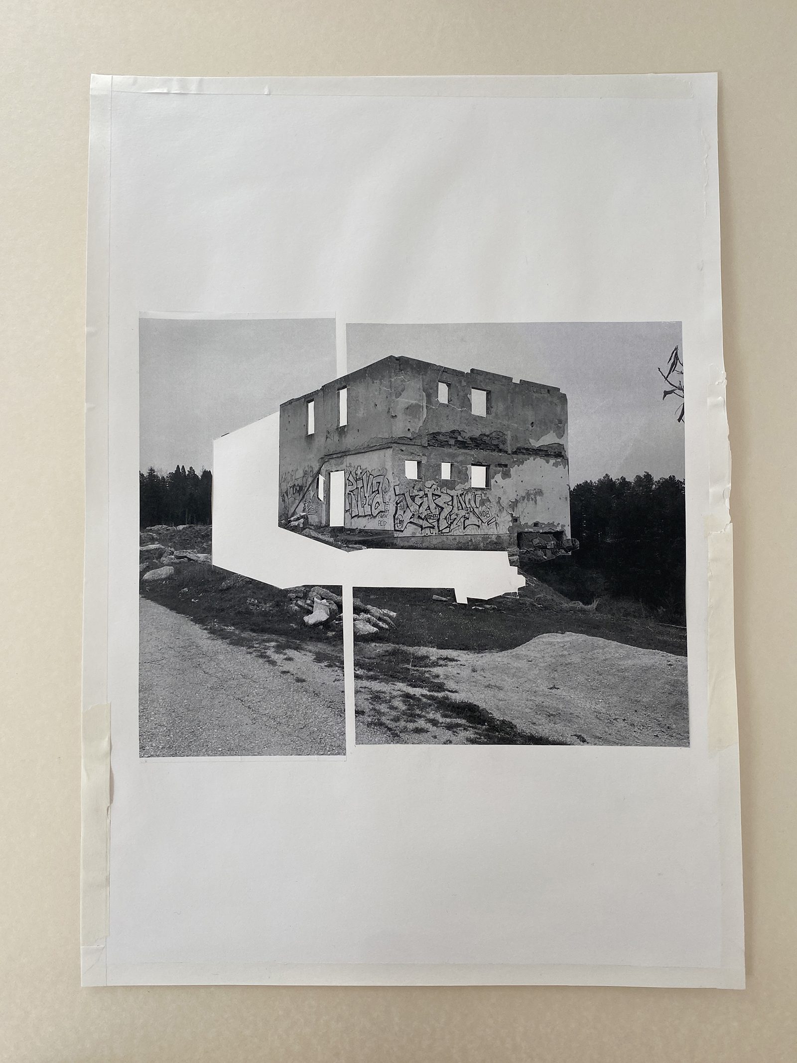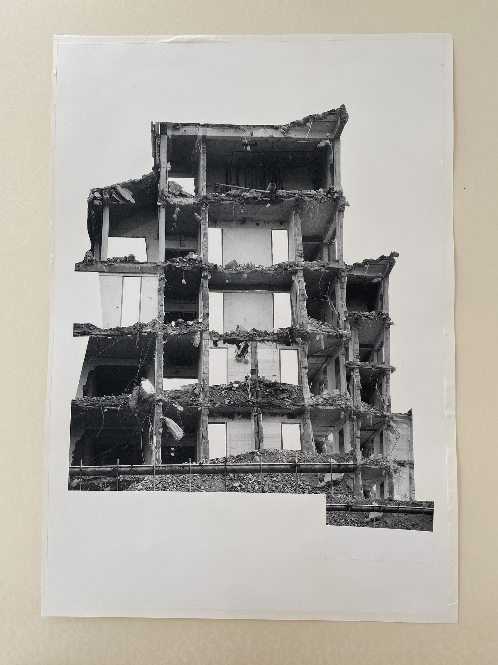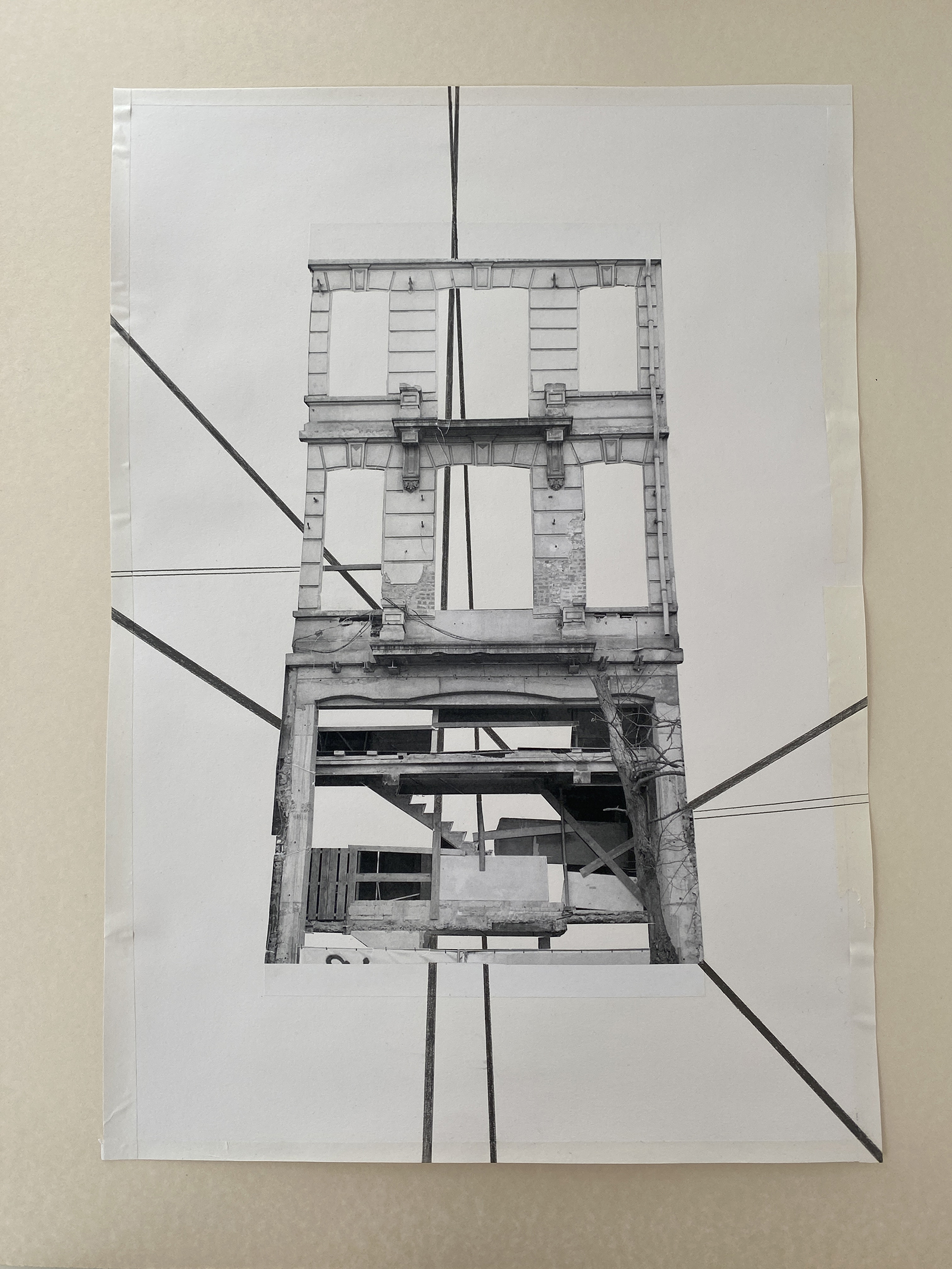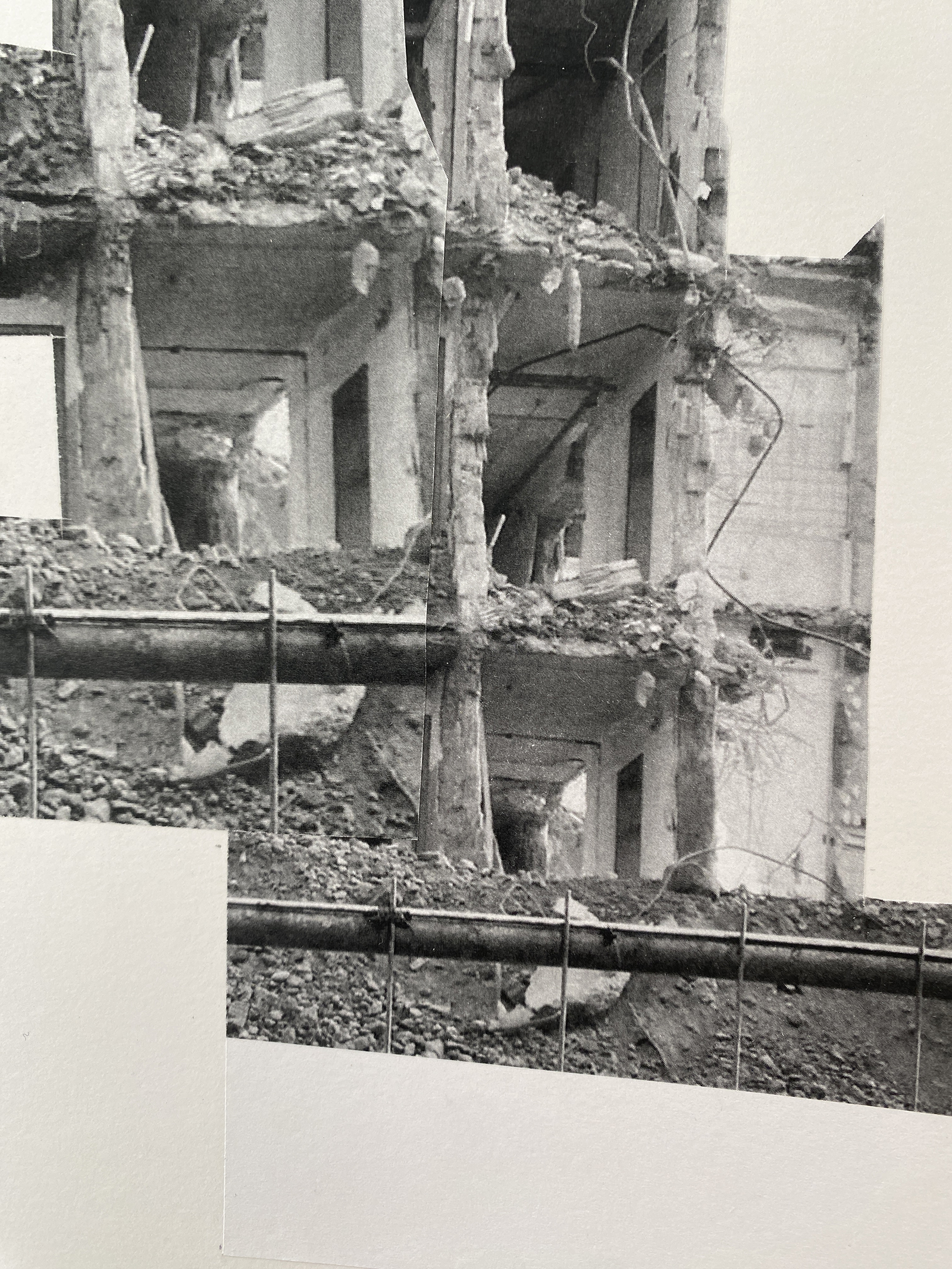Seit langer Zeit fotografiere ich in meinem direkten Umfeld und auch auf Reisen fragmentierte Gebäude. So ist über die Jahre ein Archiv der zeitgenössischen Ruinen entstanden, das ich als Grundlage für Collagen verwende. Die Gründe für die Fragmentierung sind unterschiedlich: Verfall durch Zeit, Abriss, Aufbau und noch immer – und immer wieder Krieg.