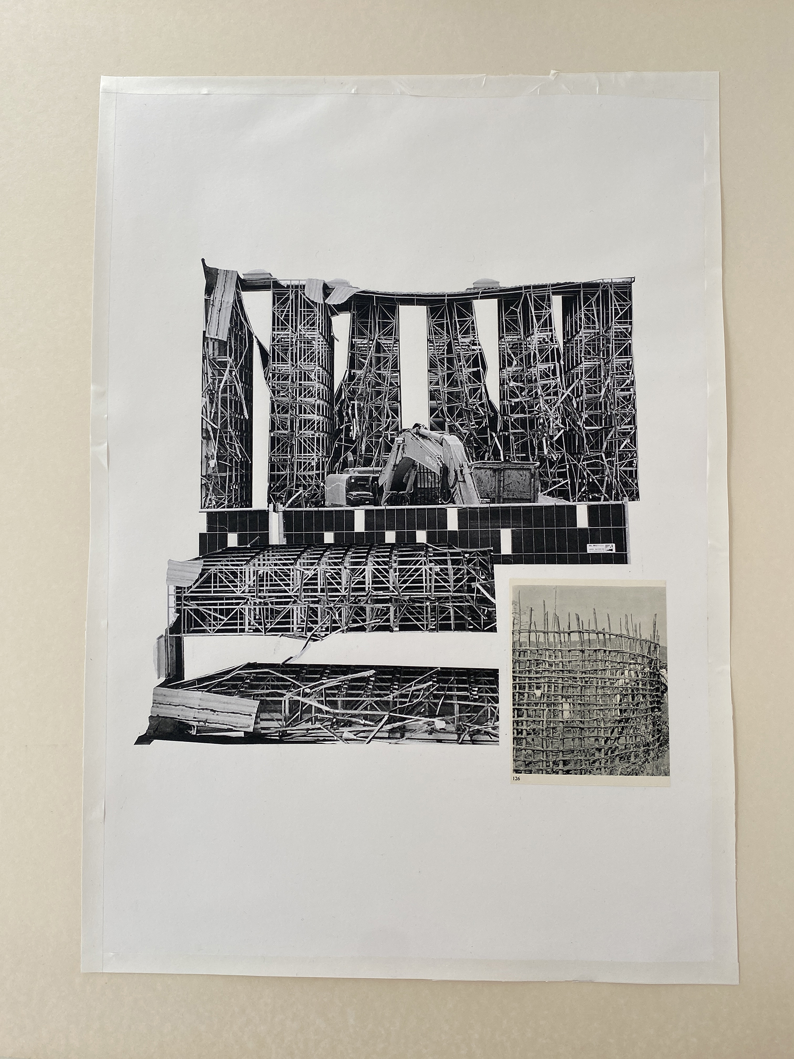 Die Kriegsruine zeugt von absoluter Unmenschlichkeit. Verfall und Abriss zeigen wirtschaftliche Not und Veränderung und den Profit einer kleinen privilegierten Gruppe. Am Aufbau interessiert mich der Umstand, dass sich im Bau befindliche Gebäude ruinös erscheinen. Das ist bereits das Thema meiner Baustellen-Collagen-Serie „Heritage“, die sich mit dem Einfamilienhaus-Bauboom in der Zeit des Wirtschaftswunders nach dem zweiten Weltkrieg befasst. Hier interessiert mich die Baustelle mehr, als die heile Einfamilienhauswelt, da sie optisch mehr dem wirklichen Spirit dieser Zeit, der vom Krieg kaputten Menschen entspricht („Something new is being built and yet, it looks like a desaster.“ 1) Auch heutige Baustellen zeugen oft von Kaputtheit und Brutalität, wenn man sich die Arbeitsbedingungen und Situationen der Arbeitskräfte vor Augen führt.